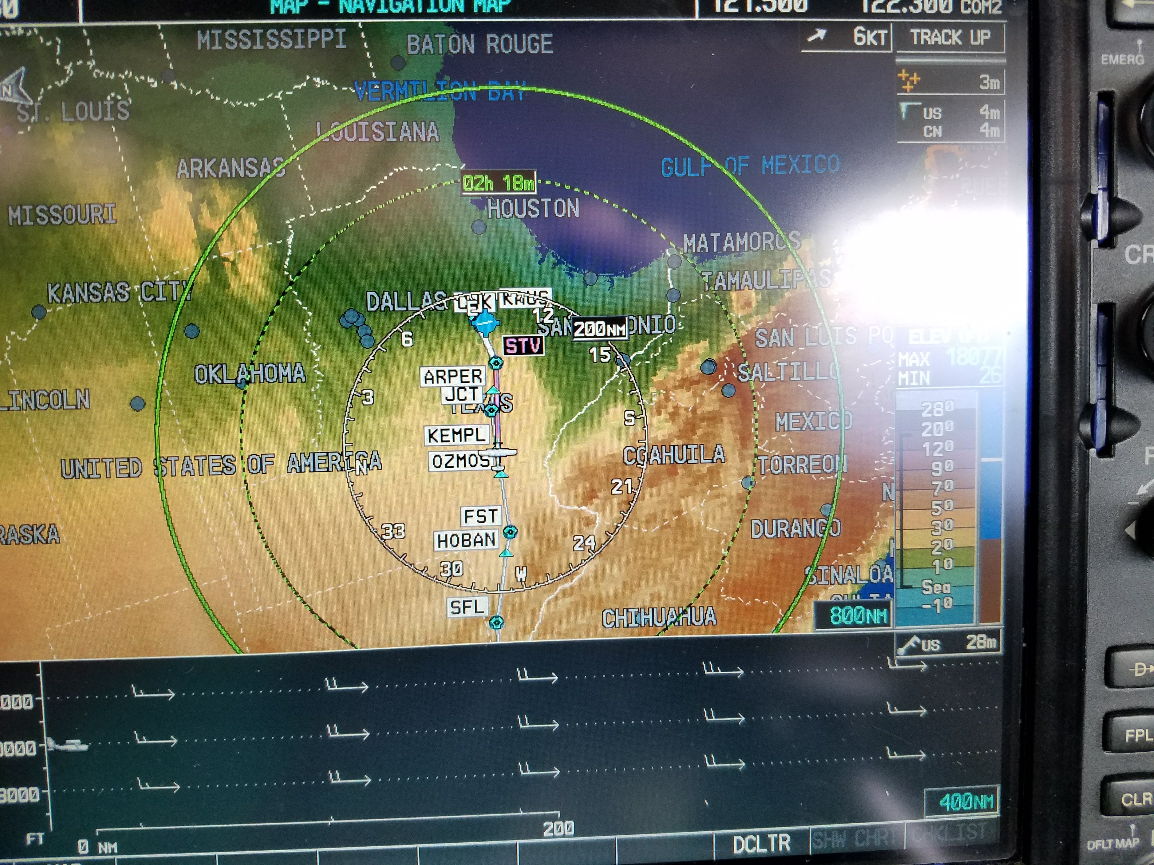 The Austin area had high clouds but unlimited visibility, and I arrived with the computer showing over two hours remaining fuel endurance left, plus another 45 minute IFR reserve.