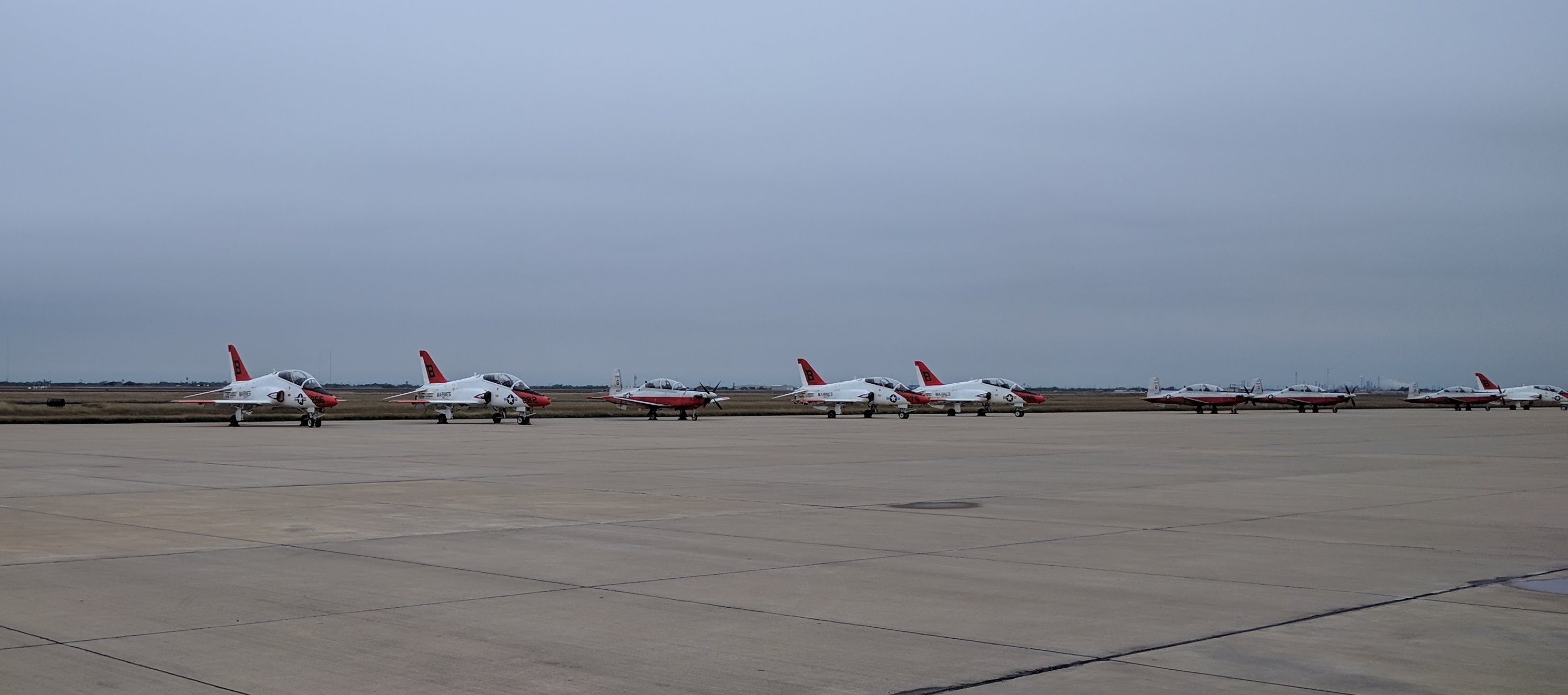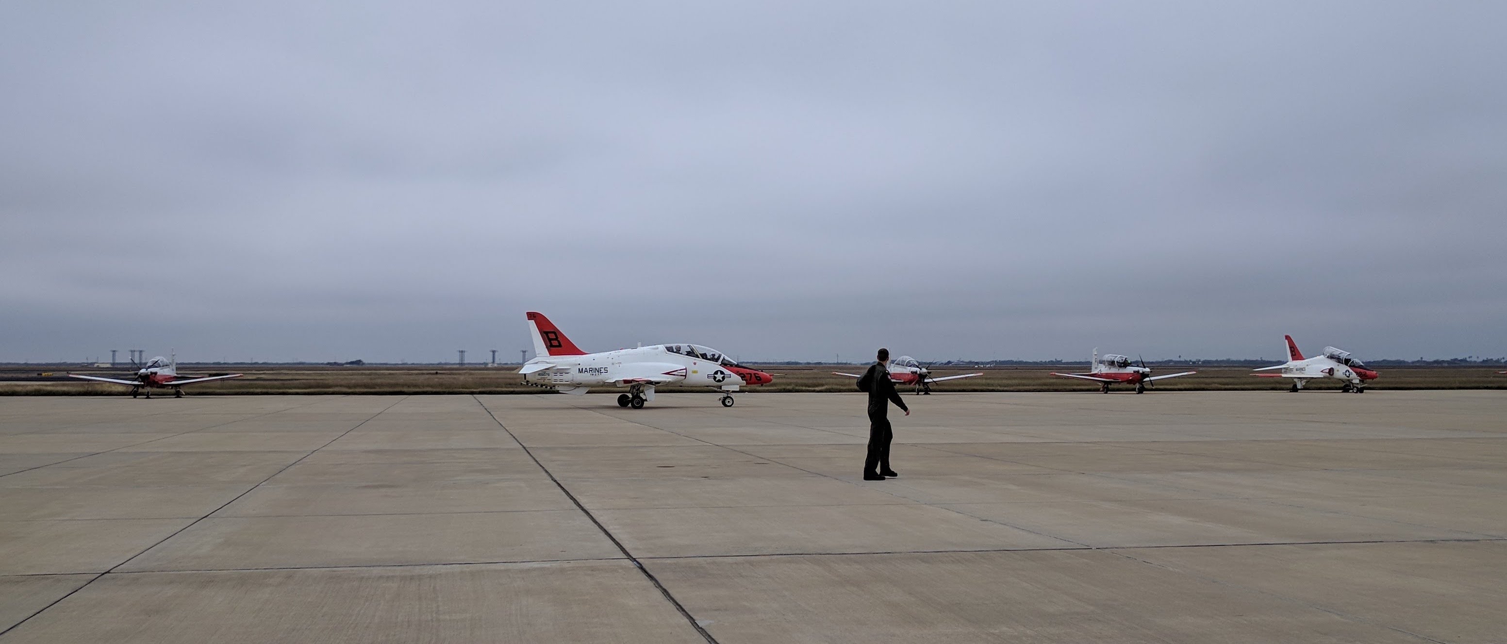 When we’d parked at the FBO and shut down, my colleagues pointed out that the flight of aircraft behind us were US Navy T-45 Goshawks, coming our way!