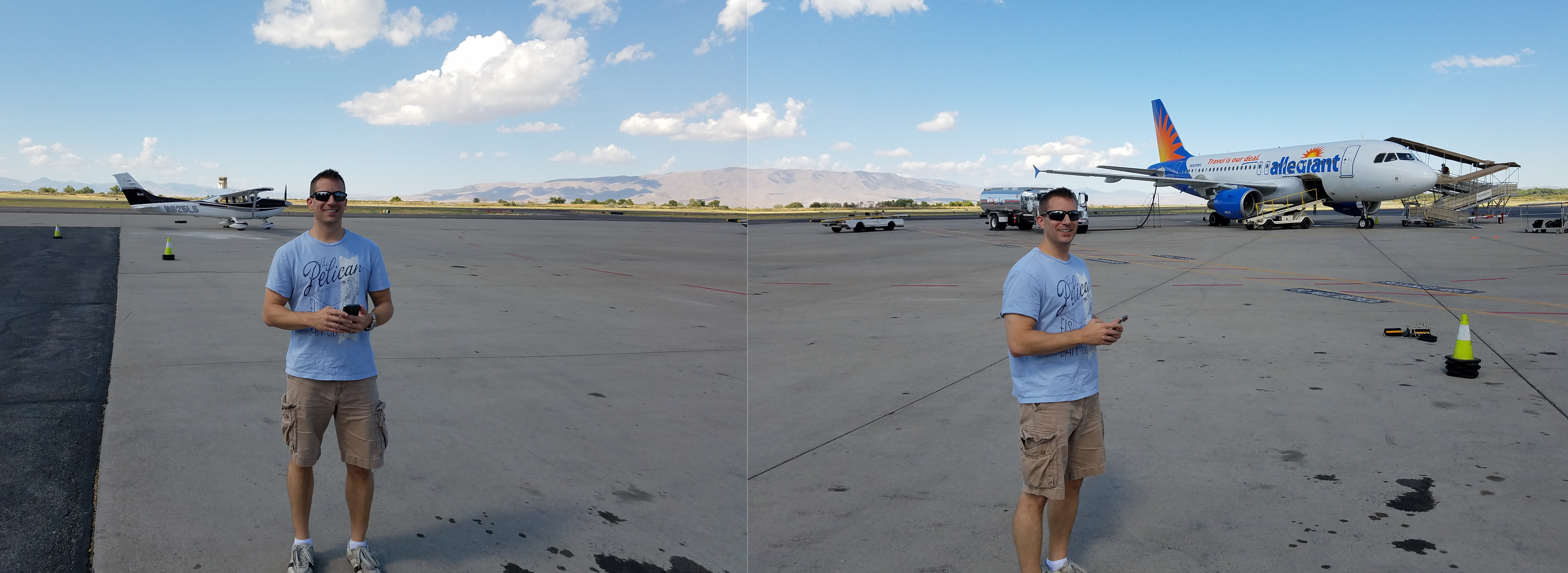 In Provo, we were marshaled to park right next to this Airbus A319 from Allegiant, which just about started loading passengers. I didn’t take a proper panoramic picture, so I munged this together; the positioning is right for the aircraft.