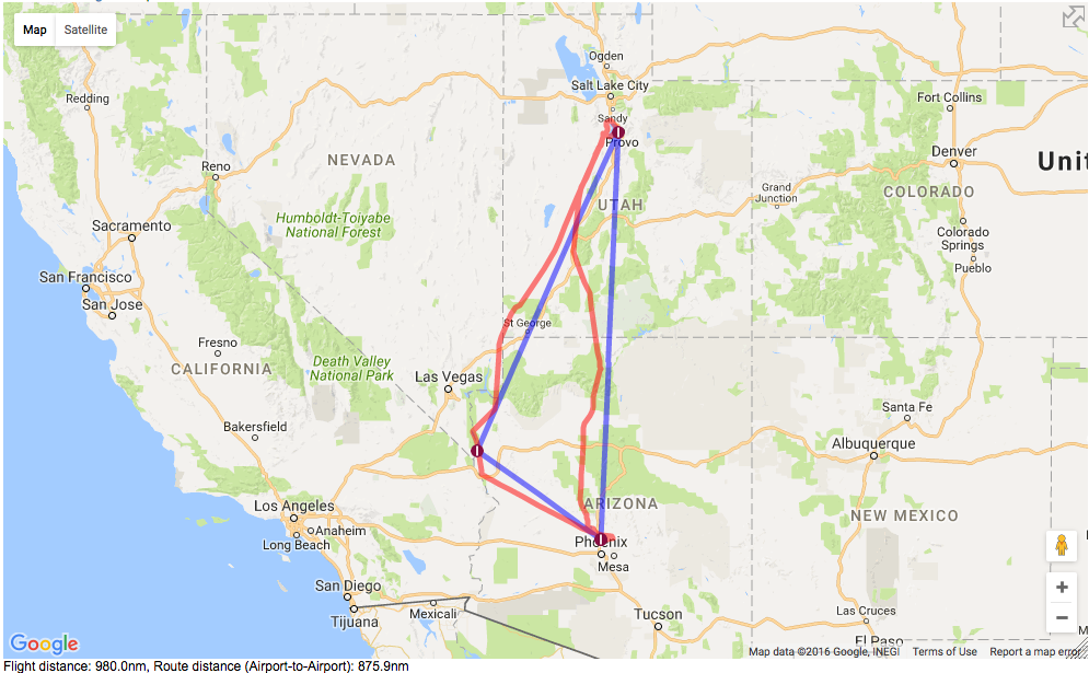 I’m training to be able to fly in clouds and other poor visibility situations. Part of the requirements for this “Instrument Rating” is to fly cross-country, on instrument rules, and do instrument landings at three airports, a task I undertook last Friday. I chose to visit my colleagues in Provo, Utah a BBQ lunch we’d been wanting to recreate for a while. The intended second stop was Cedar City, UT, home to the Utah Shakespeare Festival, but thunderstorms across the Utah/Arizona border prompted a diversion to Las Vegas, followed by a second in-flight diversion for winds to Bullhead City / Laughlin, NV.